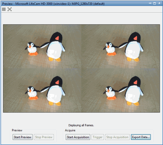 Под областью, в которой отображаются кадры, отображаются текстовые сообщения с информацией о текущем состоянии окна. Например, на рисунке выше этот текст указывает, что отображаются все полученные кадры. После запуска и остановки предварительного просмотра в тексте будет указано, что инструмент готов к получению данных.