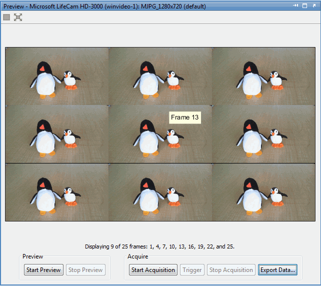 Когда сбор данных прекращается, при входе в память или на диск и в память в окне предварительного просмотра отображаются все или некоторые кадры сбора данных. Окно может отображать до девяти кадров. При получении более девяти кадров он будет отображать кадры с четным интервалом на основе общего количества кадров. Монтаж девяти кадров линейно индексируется из полученных изображений. Текст под изображениями будет содержать список отображаемых кадров. Можно также навести курсор на каждый кадр, чтобы увидеть номер кадра, как показано на следующем рисунке.