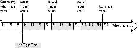 Для удобства панель инструментов возвращает время выполнения первого триггера в объекте ввода видео InitialTriggerTime собственность. На этом рисунке показано, какой триггер возвращается в этом свойстве при настройке нескольких триггеров.