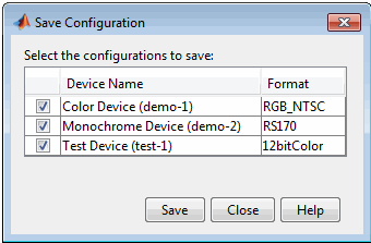 В диалоговом окне Сохранить конфигурацию (Save Configuration) отображается текущий выбранный формат устройства, а также все другие параметры, выбранные в обозревателе оборудования во время сеанса работы с инструментом. Все форматы выбираются по умолчанию, что означает, что их конфигурации будут сохранены. Если сохранение конфигурации не требуется, удалите ее из списка.