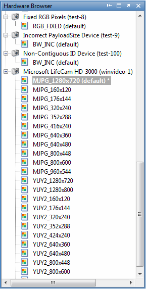 На панели «Обозреватель оборудования» отображаются устройства сбора изображений, подключенные к системе. Каждое устройство является отдельным узлом в браузере. Все форматы, поддерживаемые устройством, перечислены в списке устройств. Формат по умолчанию для каждого устройства указан в скобках. Информация о формате, отображаемая под устройством, поступает от адаптера устройства.