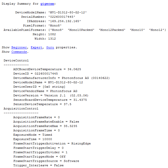 Стандарт категории GigE Vision также обеспечивает уровень экспертных знаний для имеющихся категорий. При создании gigecam , вы видите небольшой набор часто используемых свойств со ссылками на развернутый список свойств на основе опыта. Чтобы просмотреть дополнительные свойства, щелкните Начинающий (Beginner), Эксперт (Expert) или Гуру (Guru).