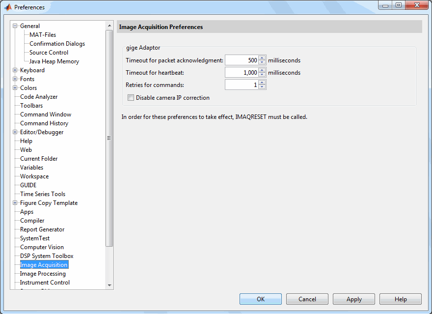 В настройках получения изображений имеются три настройки, связанные с GigE Vision. В MATLAB ® на вкладке Главная (Home) в разделе Среда (Environment) выберите Настройки (Preferences) > Получение изображения (Image Acquisition).