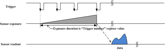Камера начинает интеграцию входящего света от первого внешнего входного заднего края триггера и экспонирует входящий свет во время затвора. Повторяйте эту последовательность до N-го входа внешнего триггера, а затем завершите интеграцию. Параметр N является обязательным и должен быть 1 или больше (N > = 1).