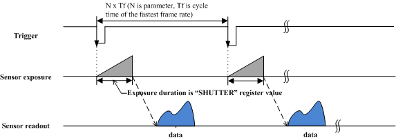 Это внутренний режим триггера. Камера выдает триггер внутри системы, и время цикла составляет N раз от времени цикла самой высокой частоты кадров. Время интегрирования входящего света описывается в регистре затвора. Параметр N является обязательным и должен быть 1 или больше (N > = 1).