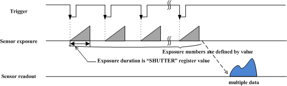 Этот режим является «режимом предустановки нескольких затворов». Он аналогичен режиму 1, но время экспозиции определяется свойством затвора. На каждом триггере свойство shutter определяет длительность экспозиции. Когда принимают N триггеров, получают кадр.