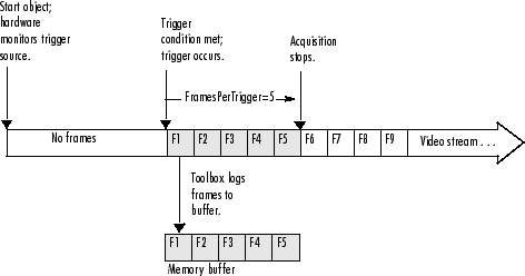 0Аппаратное обеспечение начинает мониторинг источника триггера для указанного состояния. Когда условие выполняется, аппаратные средства выполняют триггер и начинают предоставлять кадры изображения объекту. Объект получает количество кадров, указанное FramesPerTrigger собственность. Просмотр значения FramesAcquired свойство для просмотра объема полученных данных. Объект обновляет значение этого свойства по мере получения данных.