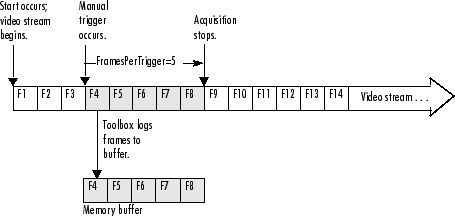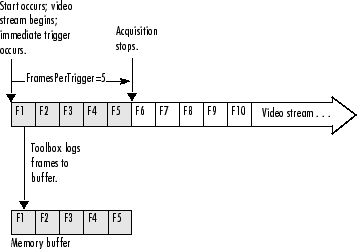 TriggerSource: 'none'В этом примере задается значение FramesPerTrigger свойство для 5. (Значение по умолчанию - 10 кадров на триггер.)