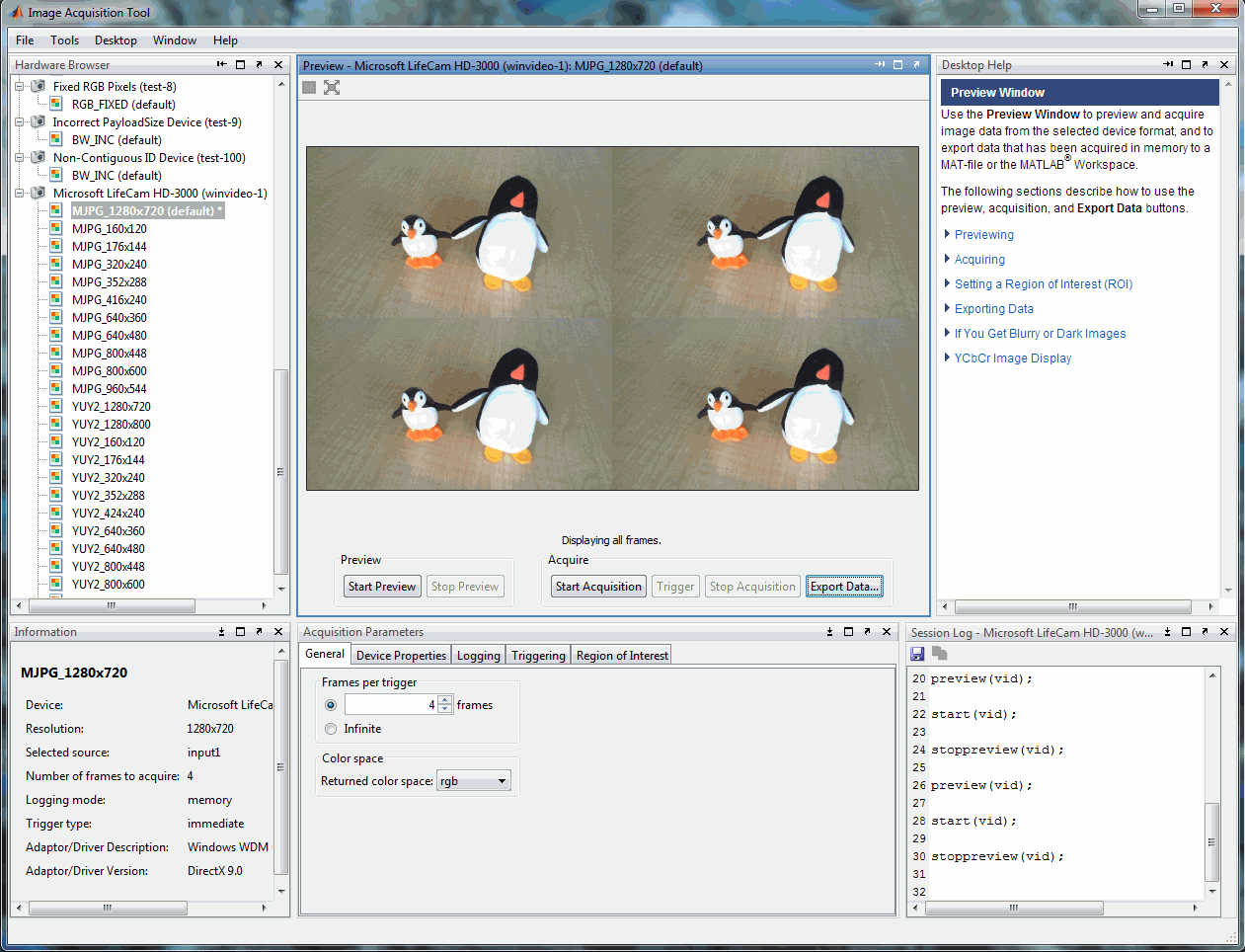 Окно предварительного просмотра - используется для предварительного просмотра и получения данных изображения из выбранного формата устройства, а также для экспорта данных, полученных в памяти, в MAT-файл, рабочую область MATLAB, VideyWriter или в инструменты, предоставляемые программным обеспечением Toolbox™ обработки изображений. Дополнительные сведения об использовании окна «Предварительный просмотр» см. в разделе Предварительный просмотр и получение данных в инструменте сбора изображений.