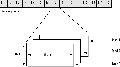 Каждый кадр изображения является трехмерным; однако формат видео определяет количество полос в третьем измерении. Для цветных видеоформатов, таких как RGB, каждый кадр изображения имеет три полосы: по одной для красных, зеленых и синих данных. Другие форматы видео, такие как стандарт RS170 в градациях серого, имеют только одну полосу. Объект ввода видео сохраняет размер третьего измерения в NumberOfBands собственность.