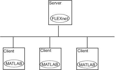 В конфигурации локального клиентского доступа диспетчер сетевых лицензий устанавливается на сервере, а MATLAB - на каждом клиентском компьютере. Когда пользователи на клиентских компьютерах запускают MATLAB, он связывается с менеджером лицензий по сети, чтобы получить лицензионный ключ. На этом рисунке показана одна из возможных конфигураций.