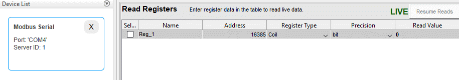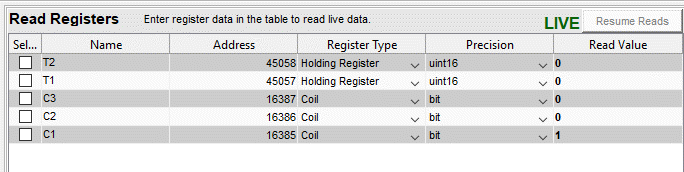 Чтобы выполнить чтение пяти регистров в таблице, щелкните Возобновить чтение (Resume Reads).