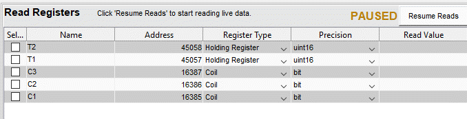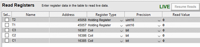Затем таблица используется для настройки дополнительных операций чтения с устройства. Заполните таблицу Read Regists для считывания данных с двух таймеров и трех коммутаторов. Поскольку в таблице автоматически отображается регистр, настроенный на вкладке «Настройка», первый таймер уже указан. Изменить имя на C1, затем добавьте еще четыре строки, чтобы настроить эти чтения.