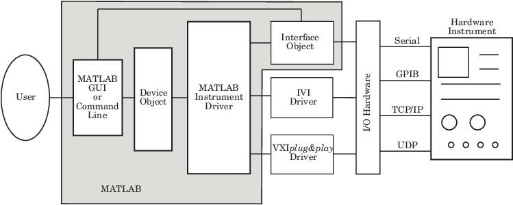 Все приборы, подключенные к компьютеру, должны взаимодействовать через интерфейс. Популярные интерфейсные протоколы включают GPIB, VISA, RS-232 (последовательный) и RS-485 (последовательный). В то время как объекты интерфейса Instrument Control Toolbox™ позволяют взаимодействовать с оборудованием на низком уровне (с помощью команды Instrument Control Toolbox), инструментарий Instrument Control Toolbox также позволяет взаимодействовать с оборудованием без подробной информации о том, как работает аппаратный интерфейс.