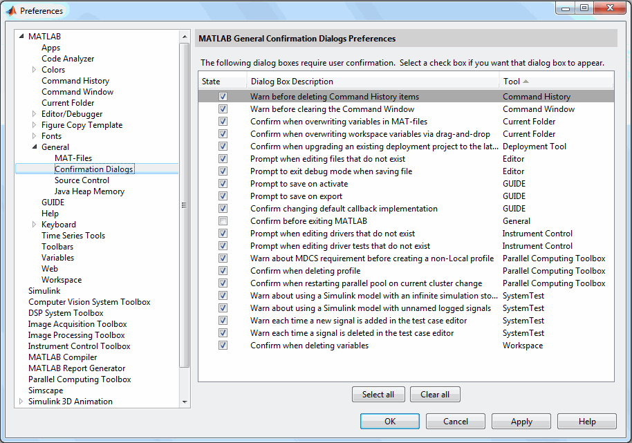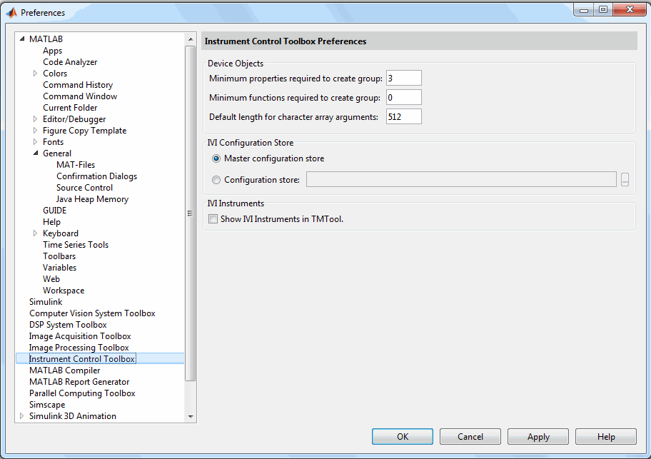 Общие настройки доступны из MATLAB ® - на вкладке Главная (Home) в разделе Среда (Environment) щелкните Настройки (Preferences). В диалоговом окне Настройки (Preferences) для параметра Управление приборами (Instrument Control) в узле MATLAB > Общие (General) в диалоговых окнах подтверждения (Confirmation Dialogs) перечислены две опции.