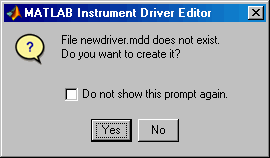 Если выбран параметр Запрашивать при редактировании несуществующих драйверов, то при открытии редактора драйверов приборов MATLAB при указании несуществующего файла драйвера выдается запрос на создание нового файла драйвера.