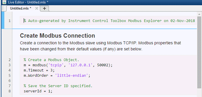 Чтобы создать сценарий из сеанса Modbus Explorer, нажмите кнопку «Создать сценарий» на панели инструментов. Сценарий отображается в редакторе MATLAB в реальном времени. Чтобы сохранить созданный сценарий, сохраните его в редакторе. Здесь показан пример сценария.