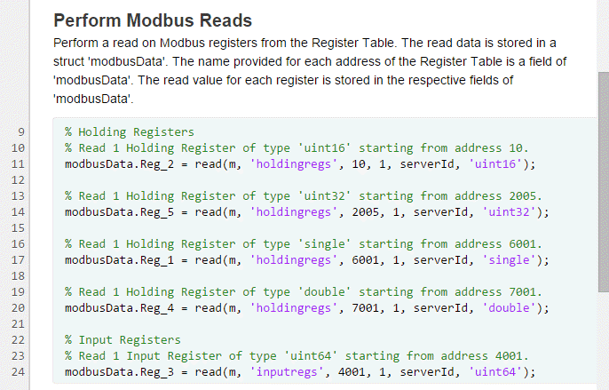 Можно создать сценарий MATLAB из сеанса Modbus Explorer, а затем запустить его в командной строке с помощью функций Instrument Control Toolbox™ Modbus. Созданный сценарий содержит конфигурацию устройства, все выполняемые операции чтения, последнюю операцию записи, выполняемую для каждого типа регистра, и задачи очистки.