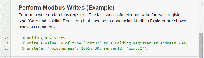 Выполнить запись Modbus - в этом разделе сценария показана последняя операция записи Modbus, выполненная в сеансе для каждого типа регистра. Он представлен в виде комментария, так что вы должны намеренно раскомментировать его, чтобы сделать запись, чтобы предотвратить неожиданные действия на вашем устройстве.