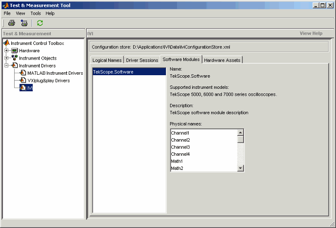 Разверните окно Instrument Drivers и щелкните IVI. Перейдите на вкладку Программные модули. (Для получения информации о других вкладках и настройках драйвера IVI в средстве тестирования и измерения см. Хранилище конфигурации IVI.)