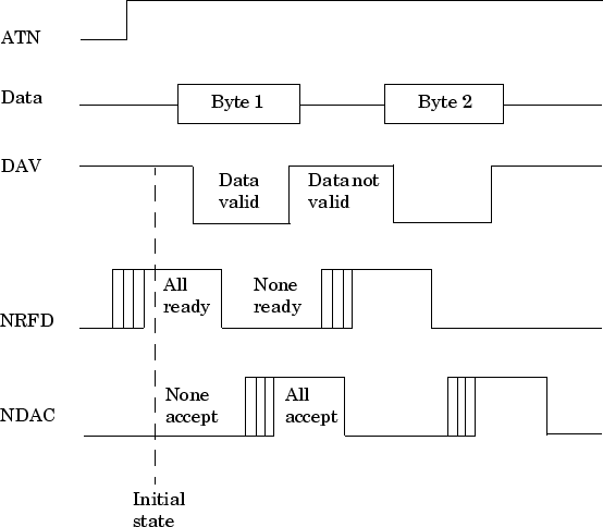 Первоначально Talker удерживает высокий уровень линии DAV, указывая на то, что данные недоступны, в то время как прослушиватели удерживают высокий уровень линии NRFD и низкий уровень линии NDAC, указывая, что они готовы к данным, и данные не принимаются соответственно.