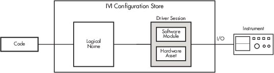 Логическое имя | Логическое имя - это компонент хранилища конфигурации, предоставляющий доступ к сеансу драйвера. Логическое имя можно интерпретировать как настраиваемый указатель на сеанс драйвера. В обычной настройке код связывается с прибором через логическое имя. Если код должен взаимодействовать с другим инструментом (например, с аналогичной областью в другом местоположении), обновите только логическое имя в хранилище конфигурации IVI, чтобы указать на новый сеанс драйвера. Нет необходимости переписывать код, поскольку он использует одно и то же логическое имя. |