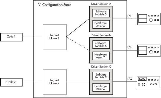 На следующем рисунке показан пример хранилища конфигурации IVI с несколькими заменяемыми компонентами. Код 1 требует доступа к осциллографам в двух разных местах (аппаратный ресурс X и аппаратные ресурсы Y). Области аналогичны, поэтому они используют один и тот же программный модуль S. Здесь области находятся в разных местоположениях (или в одной и той же области, связанной с двумя различными местоположениями в разное время). Поэтому для каждой конфигурации требуется собственный сеанс драйвера, в данном примере сеанс драйвера A и сеанс драйвера B.