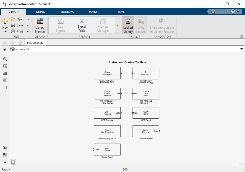 Чтобы открыть библиотеку блоков Toolbox™ управления приборами, введите следующее в окне команд MATLAB ®.