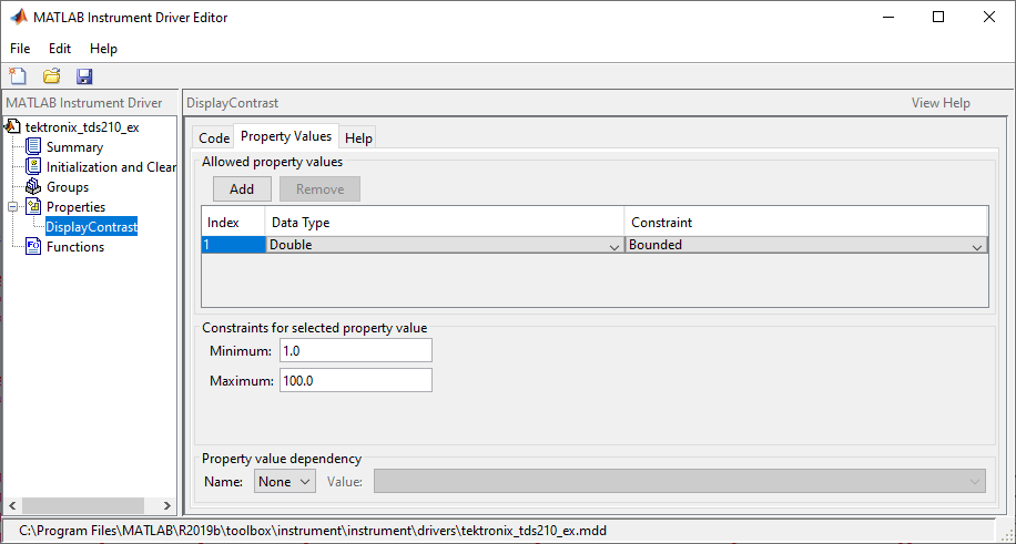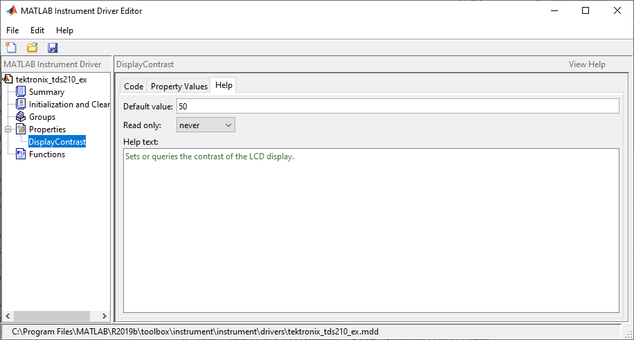 В этом примере создается свойство, которое настраивает контраст жидкокристаллического дисплея осциллографа Tektronix ® TDS 210. Дисплей осциллографа может быть настроен на значение в диапазоне[1 100]. В редакторе драйверов приборов MATLAB