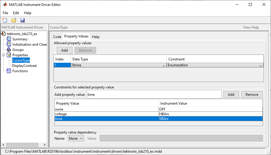 В этом примере создается свойство, которое выбирает и отображает курсор осциллографа Tektronix TDS 210. Осциллограф допускает два типа курсора. Он поддерживает горизонтальный курсор, измеряющий вертикальные единицы измерения в вольтах, делениях или децибелах, и вертикальный курсор, измеряющий горизонтальные единицы измерения во времени или частоте. В редакторе драйверов приборов MATLAB