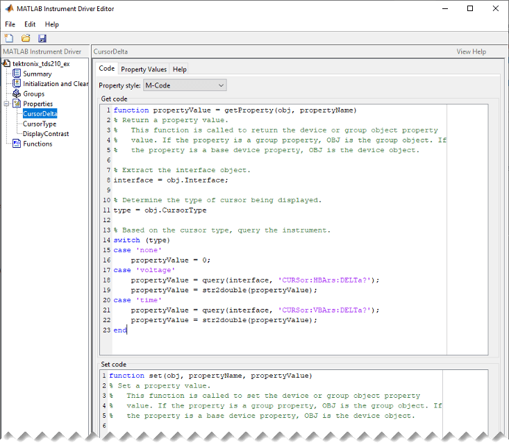 В этом примере создается свойство, которое возвращает разницу между двумя курсорами осциллографа Tektronix TDS 210. Осциллограф допускает два типа курсора. Он поддерживает горизонтальный курсор, измеряющий вертикальные единицы измерения в вольтах, делениях или децибелах, и вертикальный курсор, измеряющий горизонтальные единицы измерения во времени или частоте. В предыдущем примере было создано свойство, CursorType, который выбирает и отображает курсор осциллографа. В редакторе драйверов приборов MATLAB