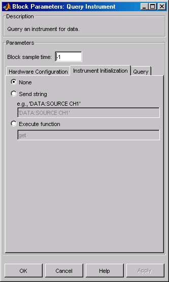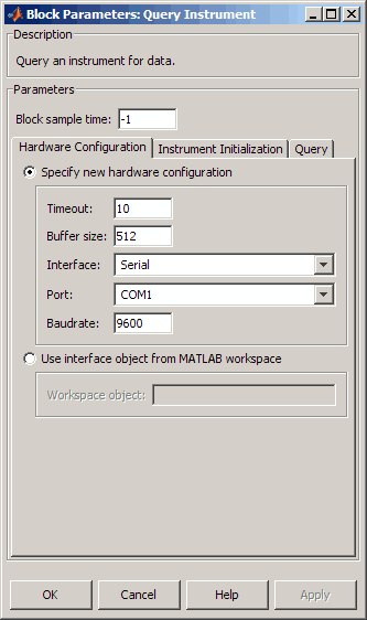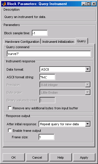 Блок Query Instrument конфигурирует и открывает интерфейс с прибором, инициализирует прибор и запрашивает данные у прибора. Конфигурирование и инициализация выполняются в начале выполнения модели. Блок запрашивает данные у прибора во время выполнения модели.