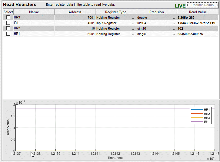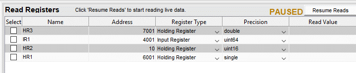 Чтобы прочитать несколько регистров, добавьте строки в таблицу, щелкнув Вставить (Insert) на панели инструментов. Новые строки добавляются в верхнюю часть таблицы. Можно добавить столько строк, сколько потребуется. Для каждой строки заполните все поля. Во время редактирования строки чтение приостанавливается, как указано в PAUSED слева от кнопки Resume Reads.