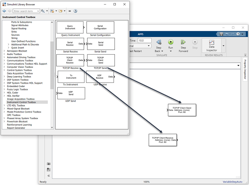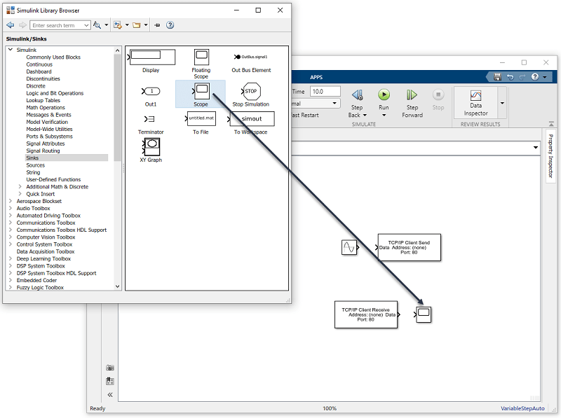 Чтобы использовать блок в модели, перетащите блок в редактор Simulink Editor. Для этой модели необходим один экземпляр блоков TCP/IP Send и TCP/IP Receive в модели.