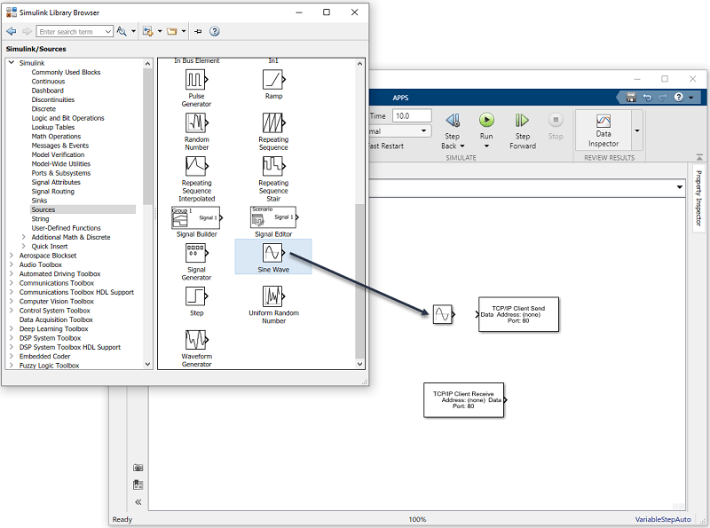 Блок отправки TCP/IP нуждается в источнике данных для отслеживания данных. Добавьте в модель блок Sine Wave (Simulink) для передачи сигналов в блок отправки TCP/IP. Чтобы получить доступ к блоку синусоидальной волны, разверните узел Simulink в дереве браузера и щелкните запись библиотеки Sources. Из блоков на правой панели перетащите блок синусоидальной волны в модель и поместите его слева от блока TCP/IP Send.