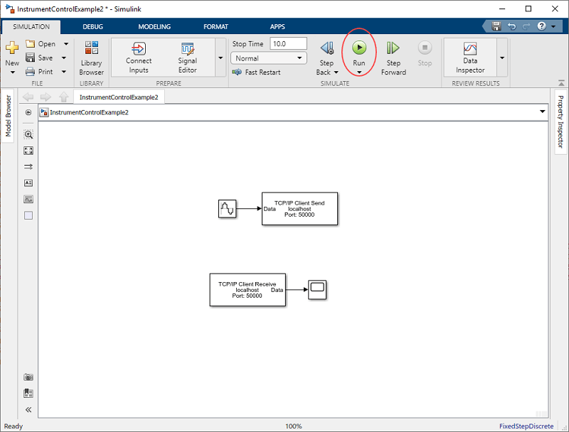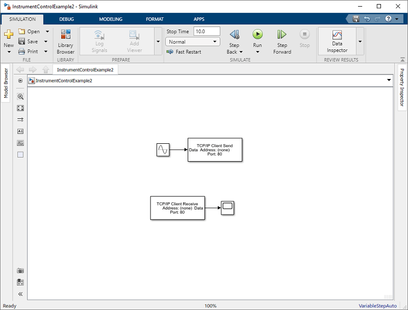 В этом примере на компьютере создается эхо-сервер, имитирующий отправку сигнала в блок TCP/IP Send и эхо результат обратно в блок Send для отправки данных. Затем используется блок получения TCP/IP для считывания этих же данных обратно в модель.
