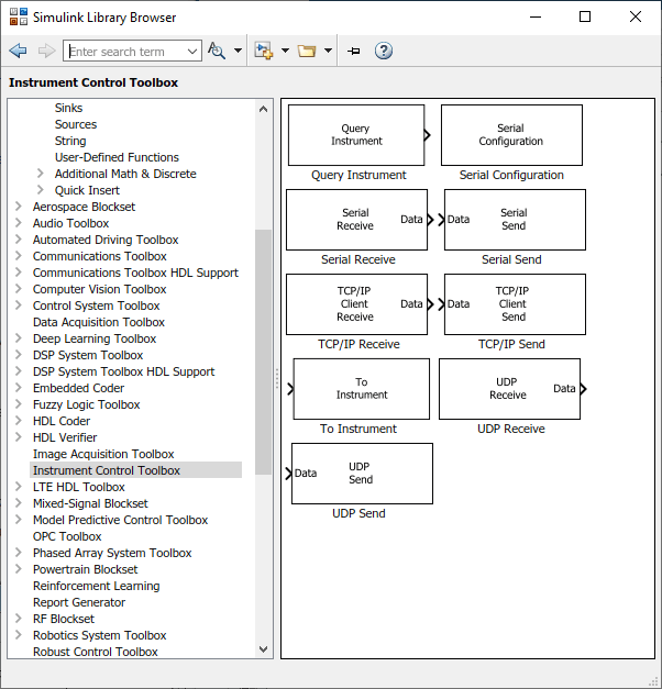 Откроется обозреватель библиотеки Simulink. Левая панель содержит дерево доступных библиотек блоков в алфавитном порядке. Щелкните Инструмент управления приборами (Instrument Control Toolbox).