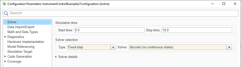 Также необходимо задать два параметра в модели. На панели инструментов Simulink щелкните Параметры модели (Model Settings) в разделе Подготовка (Prepare) на вкладке Моделирование (Simulation). В диалоговом окне Параметры конфигурации установите в поле Тип значение Fixed-step и установите в поле Решатель значение discrete (no continuous states).
