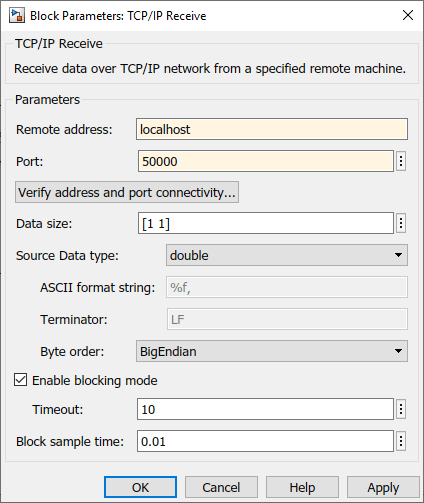 Дважды щелкните блок получения, чтобы открыть его диалоговое окно параметров. Установите в поле Удаленный адрес значение localhost и поле Port to 50000. Измените тип данных на double. В поле Block sample time установлено значение 0.01 по умолчанию. Время выборки блока здесь должно соответствовать времени в блоке синусоидальной волны, поэтому подтвердите, что они оба установлены на 0.01.