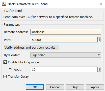 Дважды щелкните блок TCP/IP Send, чтобы открыть его диалоговое окно параметров. Установите в поле Удаленный адрес значение localhost и поле Port to 50000, так как это адрес, на который вы задали эхо-сервер при его запуске.