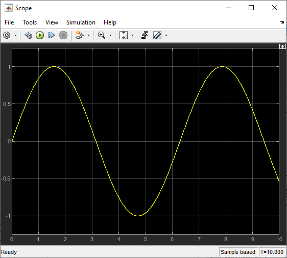 Для запуска моделирования нажмите зеленую кнопку «Выполнить» на панели инструментов редактора Simulink. Параметры панели инструментов можно использовать для указания продолжительности выполнения моделирования и остановки выполнения моделирования.