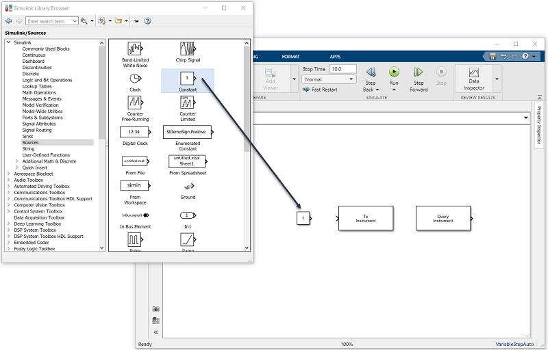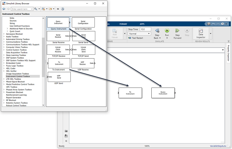 Чтобы использовать блок в модели, перетащите блок из библиотеки в редактор Simulink Editor. В этом примере требуется один экземпляр блоков «К инструменту» и «Запрос к инструменту» в модели.
