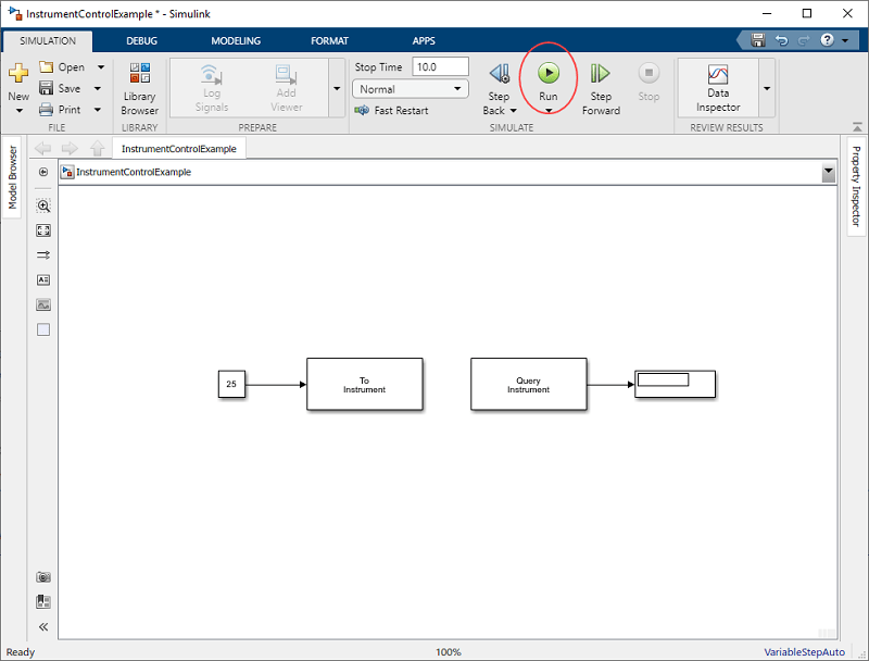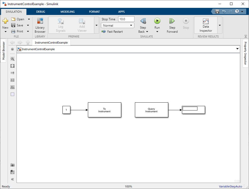 Блок To Instrument используется для записи значения в последовательный порт компьютера, а затем блок Query Instrument используется для считывания этого значения обратно в модель.