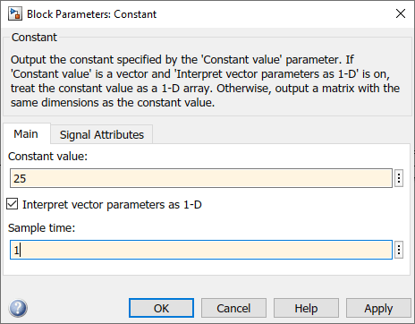 Дважды щелкните блок «Константа», чтобы открыть диалоговое окно его параметров. Измените значение константы на значение, которое требуется отправить в прибор. Для этого примера: