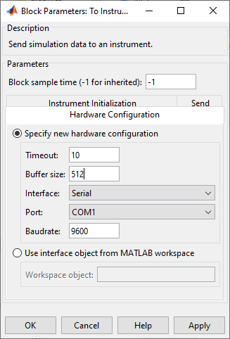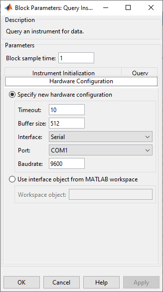 Дважды щелкните блок Query Instrument, чтобы открыть его диалоговое окно параметров. Убедитесь, что значения на вкладке Hardware Configuration соответствуют значениям Hardware в блоке To Instrument.