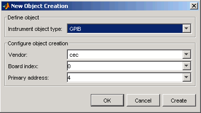 Необходимо указать интерфейс с прибором для тестирования драйвера. Тип объекта прибора может быть GPIB, VISA, TCPIP, UDP, или serial port. В зависимости от выбранного типа в диалоговом окне Создание нового объекта (New Object Creation) запрашивается дополнительная информация о конфигурации.