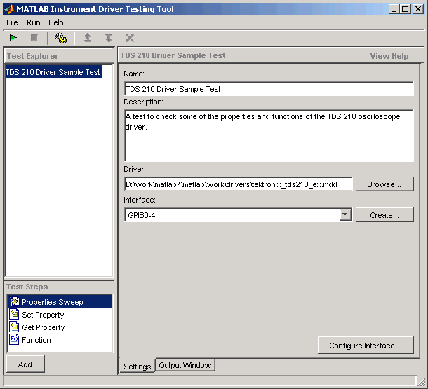 В этом примере определяется драйвер, подлежащий тестированию, и информация о глобальной настройке для теста. Выполняется тестирование драйвера, созданного в примерах «MATLAB Instrument Driver Editor Overview».