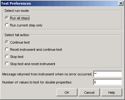 В этом поле указывается ожидаемая строка, возвращаемая инструментом при отсутствии ошибки. Если вы указываете, что шаг проходит, когда из прибора не возвращается ошибка, инструмент сравнивает строку, возвращенную из прибора через geterror к строке, указанной здесь в диалоговом окне «Установки». Если строки совпадают, то инструмент предполагает отсутствие ошибки от инструмента.
