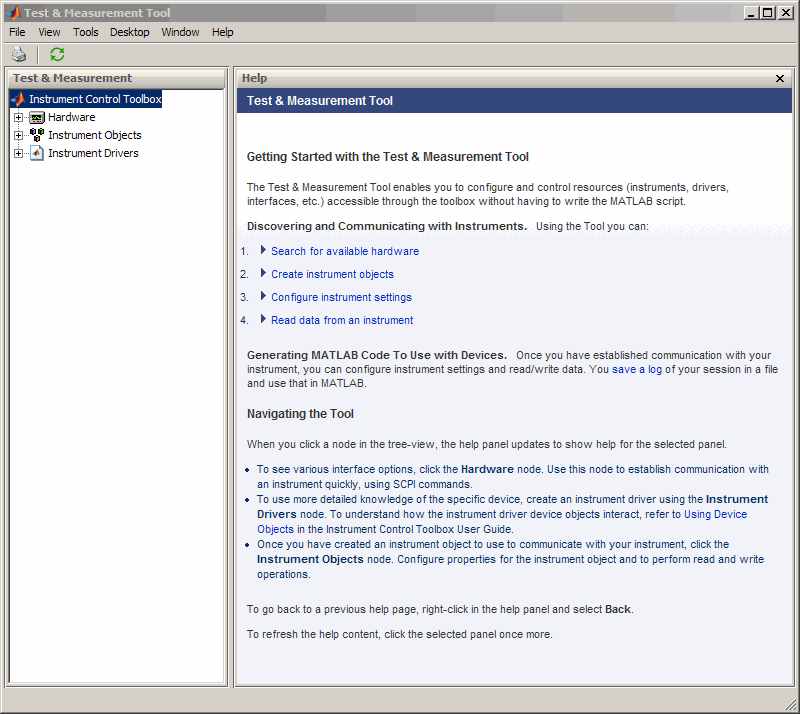 Инструмент Test & Measurement Tool (tmtool) позволяет настраивать и управлять ресурсами (приборами, последовательными устройствами, драйверами, интерфейсами и т.д.), доступными через панель инструментов, без необходимости записи сценария MATLAB ®.