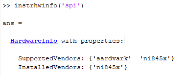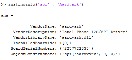 Убедитесь, что Instrument Control Toolbox распознает ваше устройство, используя instrhwinfo функции с помощью spi имя интерфейса и имя адаптера, либо aardvark или ni845x. Например: